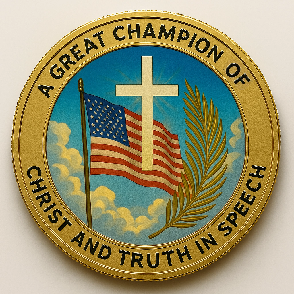 • Reverse Side: Displays the phrase “A GREAT CHAMPION OF CHRIST AND TRUTH IN SPEECH” in bold lettering. At the center, a cross (symbolizing faith), the American flag (representing patriotism), and a palm branch (a symbol of martyrdom) come together, honoring Kirk’s dual commitment to his beliefs and his country.