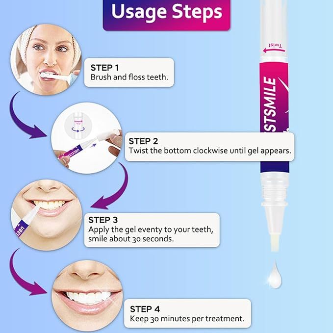 【Easy to use】: 1. Brush your teeth or use water to clean your teeth。 2. Turn the end of the product to release the gel, apply it to your teeth, 【wait 30 seconds】。 3. Clean your teeth with water 4. Bloom your smile,You can carry it with you (about 5 inches in size) on daily trips, shopping, dating, meeting clients and other important occasions. Use it at any time. It only takes 1 minute to make you smile confidently.